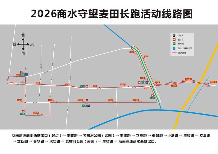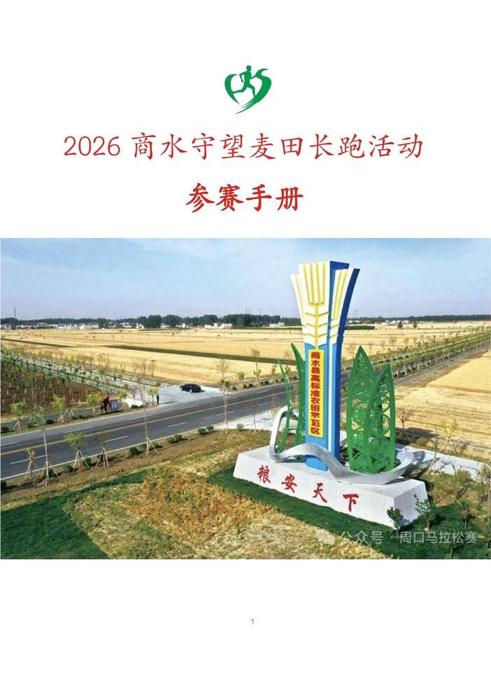 2026商水守望麦田长跑活动竞赛规程 一、主办单位商水县人民政府二、承办单位商水县教育体育局三、指导单位周口市马拉松长跑协会四、运营单位中慈体育发展有限公司五、竞赛日期和地点2026年4月26日(周日)07:00 商水县高标准农田示范区(商南高速商水西站出口)六、竞赛项目及规模20公里组,规模2000人。七、比赛路线 路线描述:商南高速商水西站出口(起点)→ 丰收路 → 老枯河公园(北园) → 丰收路